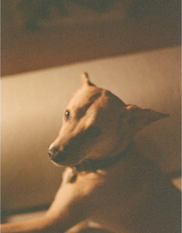 The morning after the dream, I find Sid on the couch tucked in the corner like a giant croissant. Her eyes are pressed shut, two lids that open and close like elevator doors. I never even have the opportunity to stick my finger under her snout, she senses I’m there and one eye pops open just as I’m crouching down beside her. A similar look of alertness, who’s there, about to touch me?