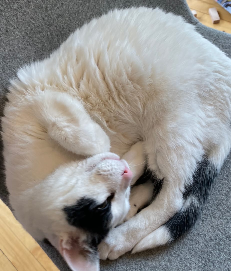 Mikimoto supported Christian through the transition of Ada and Perrin living in two homes. He supported us through lockdown and the summer of a global uprising. He supported us as we worked each day from home, snug in our laps, or in his special two-story basket, or the bin with blankets. He took to a round teal ottoman that he demanded we not donate by throwing himself on top in a peaceful protest as it sat by the back door ready to be loaded up. He won, and it remained in Christian’s office, a perfect perch for him to help Christian code. For me, he welcomed Sid and I into his home and I felt his love immediately. I don’t have a single friend or know of a single petsitter we had that didn’t adore Motes. I don’t know of a single toddler that didn’t find glee shoving him into his cat door and he was the kinda chill dude that went along for the ride.